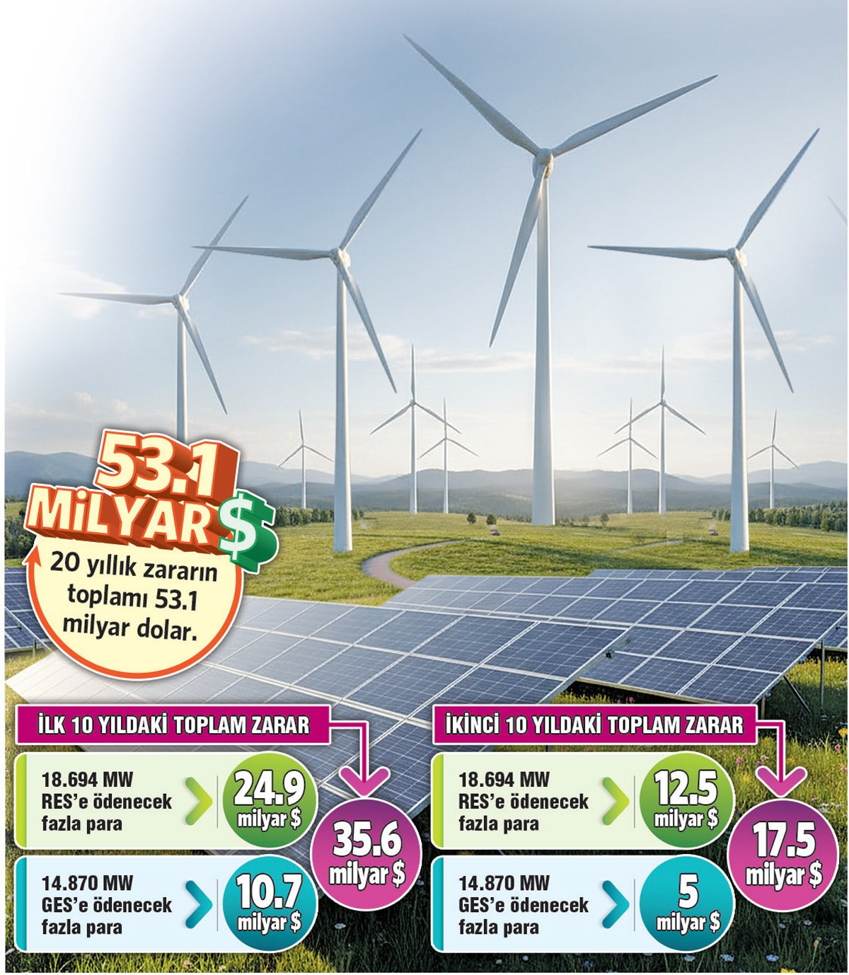 İktidarın 2023’te 33 bin 519 megavat (MW) depolamalı rüzgar enerjisi (RES) ile güneş enerjisi santrali (GES) lisanslarını kamu çıkarlarını düşünmeden ihalesiz dağıttığını söyleyen İYİ Parti Milletvekili Erhan Usta, bu nedenle devletin önümüzdeki 20 yılda 53 milyar 100 milyon dolar (yaklaşık 2 trilyon 115 milyar TL) zarara uğrayacağını savundu.