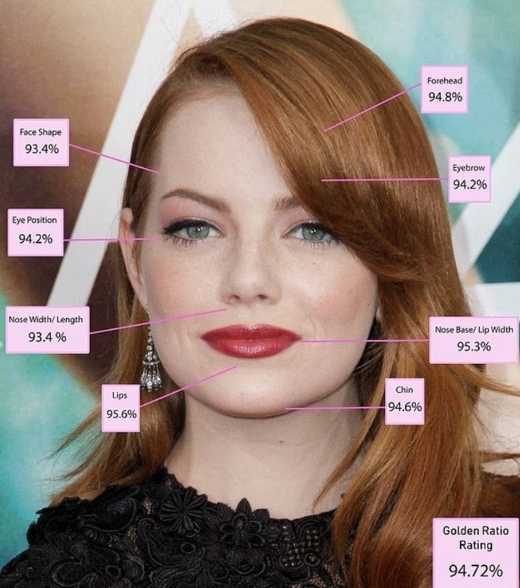 Estetik uzmanı Dr. Julian De Silva’nın açıkladığı sonuçlara göre, fiziksel mükemmellik için yüzün tüm unsurları ölçüldüğünde ilk sırada ABD’li oyuncu Emma Stone yer aldı.