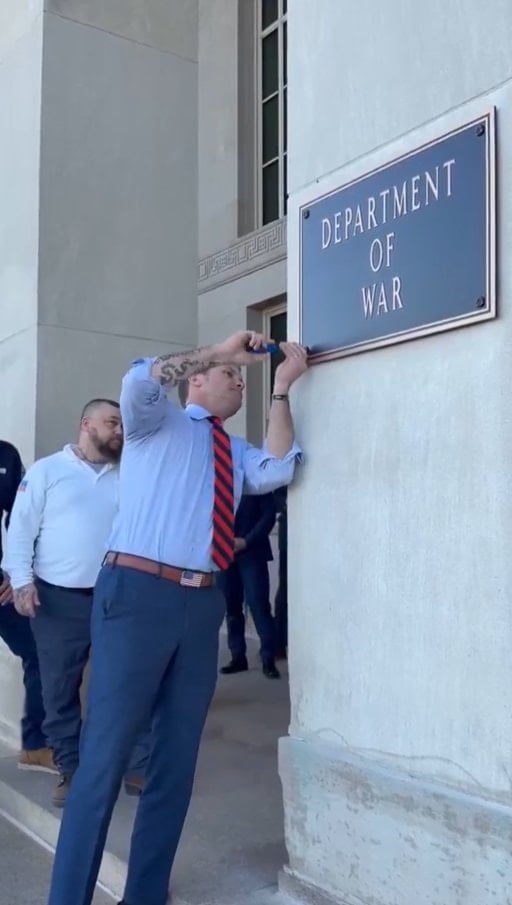 Binanın iki giriş kapısındaki eski bronz levhalar kaldırıldı ve yerine “ABD’nin savaş gücünü yöneten federal kurumun yeni adını taşıyan” levhalar yerleştirildi.