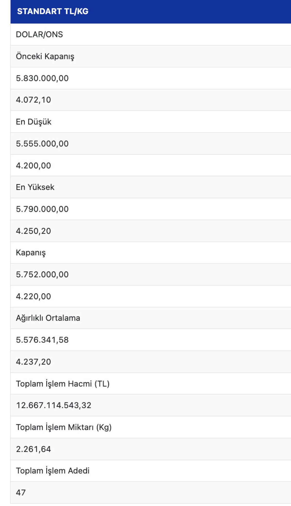 KMKTP’de altında toplam işlem hacmi 12 milyar 667 milyon 114 bin 543,32 lira, işlem miktarı ise 2 bin 261,64 kilogram oldu.