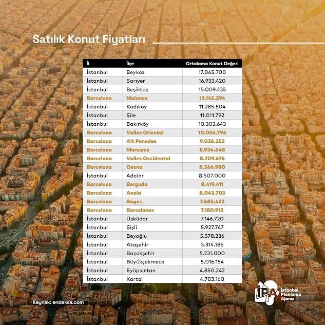 Gökçe’nin paylaştığı verilere göre Beykoz, Sarıyer, Beşiktaş, Kadıköy, Şile ve Bakırköy’deki ortalama satılık konut fiyatları Barcelona’da bir bölge hariç, diğer tüm bölgelerden daha pahalı.