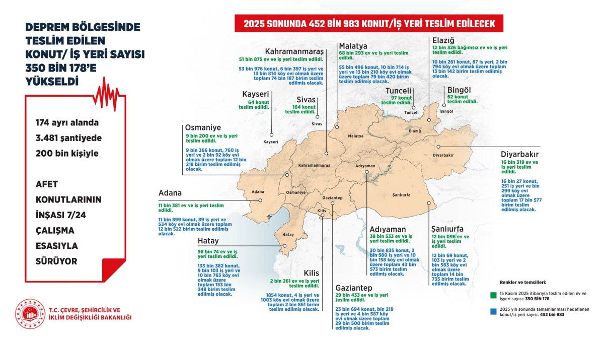 Yeni konutların teslimatı ile birlikte deprem bölgesi genelinde teslim sayıları 286 bin 708’i konut, 12 bin 189’u iş yeri ve 51 bin 281’i köy evi olmak üzere toplam 350 bin 178’e yükseldi.