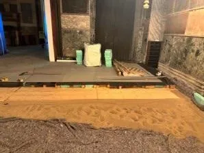 Ardından iş makinelerinin hareket edeceği alanda yükün yayılmasını ve mermerlerin zarar görmemesini sağlayan çok katmanlı geçici döşeme sistemi kuruldu: buhar geçişine izin veren örtü, keçe, kum, 18 mm kontra, 10×10 cm ahşap karkas, karkaslar arasına xps levha, karkasların üzerine ses önleyen şilte ve en üst katmana baklava sac uygulanarak zemin tamamen korumaya alındı. İş makinelerinin egzoz dumanının yayılmaması için de duman emici cihazlar kullanılıyor.