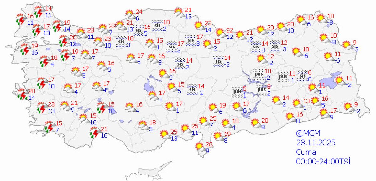 Cuma günü İstanbul, Kırklareli, Edirne, Tekirdağ, Çanakkale, Yalova, Bursa, Balıkesir, Manisa, İzmir, Kütahya, Afyonkarahisar, Uşak, Isparta, Antalya, Burdur, Denizli, Muğla ve Aydın illerinde gök gürültülü sağanak yağışlar bekleniyor.