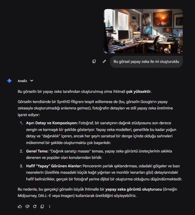 Görselin kendisinde bir SynthID filigranı tespit edilemese de (bu, görselin Google’ın yapay zekasıyla oluşturulmadığı anlamına gelmez), fotoğrafın detayları ve stili yapay zeka üretimine işaret ediyor” cevabını verdi. (Yani tam olarak kesin konuşmuyor ama şüpheleniyor.)