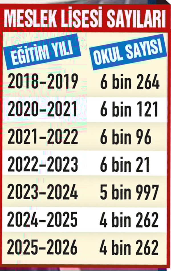 Yıllar önce, “Mesleki Eğitim, Memleket Meselesi” sloganıyla yola çıkan sanayiciler ve iktidar, yine el ele verdi. Özel ve devlet, tüm meslek liselerinin sayısı; son 6 yılda 6 bin 264’den, 4 bin 264’e düşürüldü. 1.759’u son 2.5 yılda olmak üzere 7 yılda tam 2 bin meslek lisesi kapatıldı. Meslek liselerindeki öğrenci sayısı da 2.4 milyondan 1.6 milyona düştü.