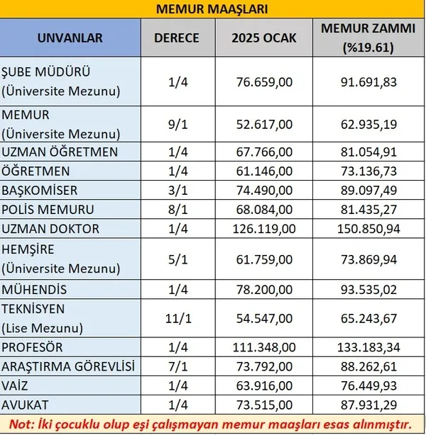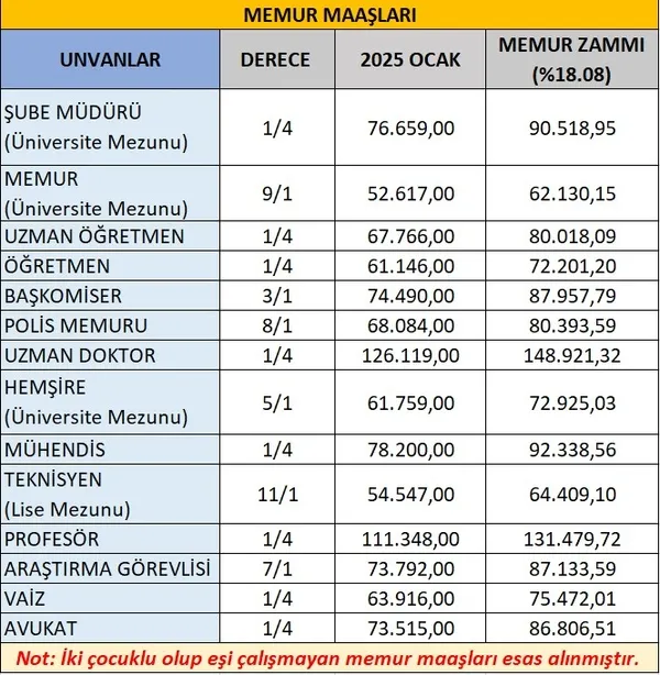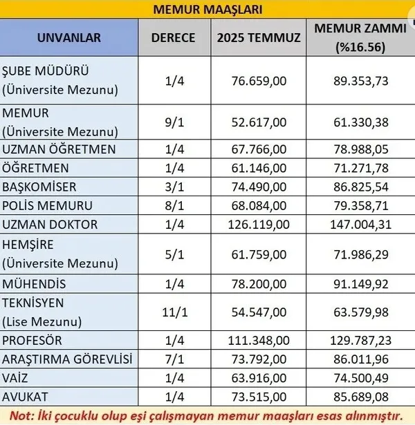 Haziran 2025 enflasyon verisinin belli olmasıyla memur ve emekli memur maaşları netleşti. Haziran ayında SSK ve Bağkur emeklilerinin alacağı zam oranı yüzde 16,67 olarak açıklandı. Memur ve memur emeklisi için ise temmuz ayı zammı 15,57 olarak hesaplandı. Haziran-Aralık 2026 döneminde memur maaşlarına yüzde 5’lik toplu sözleşme zammı da yansıtıldı. Böylelikle aile yardımı ödeneği dahil en düşük memur maaşı 43 bin 726 liradan 50 bin 503 liraya, en düşük memur emekli aylığı 19 bin 617 liradan 22 bin 671 liraya yükseldi.