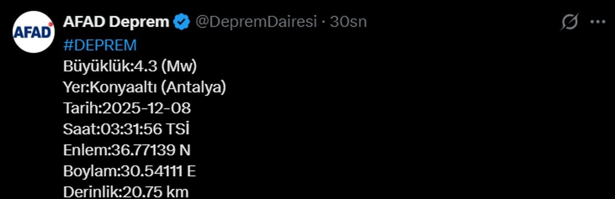 Van’ın ardından bu kez Antalya sallandı. AFAD tarafından yapılan açıklamaya göre saat 03.31’de merkez üssü Konyaaltı olan bir deprem meydana geldi. 4.3 büyüklüğündeki depremin derinliği ise 20.75 km olarak açıklandı.