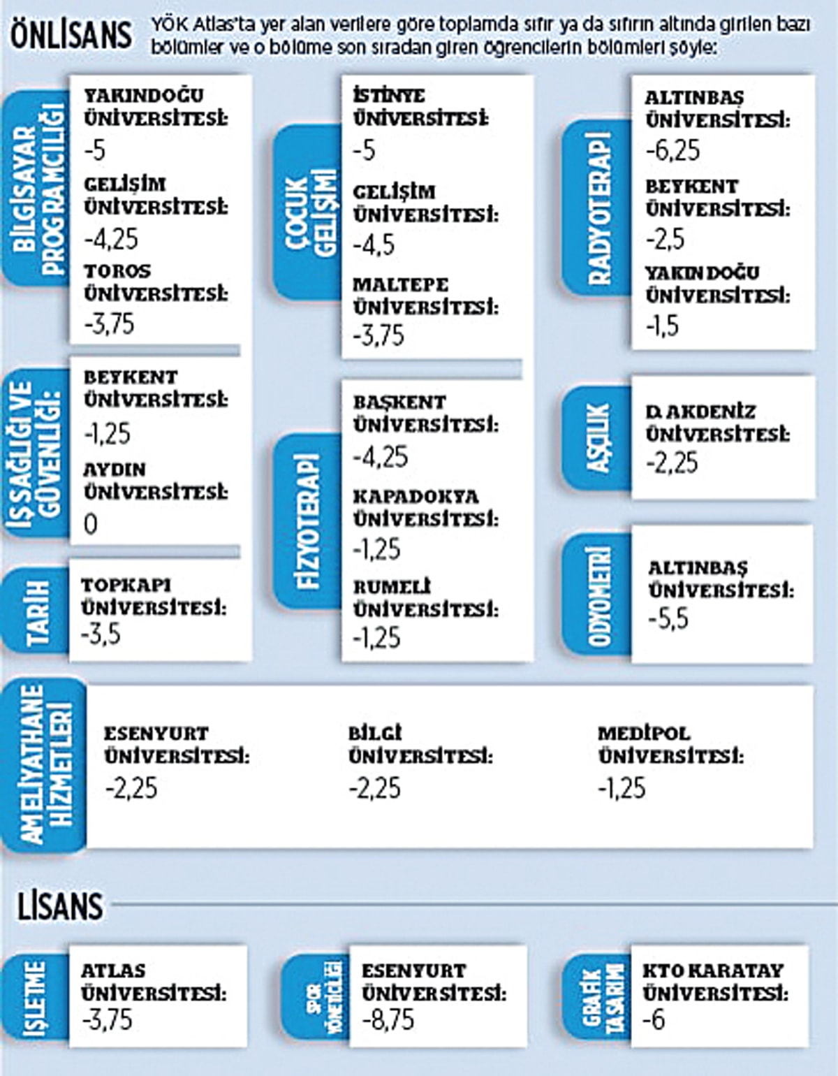 BirGün’den Mustafa Kömüş’ün haberine göre; Bilgisayar programcılığı, Çocuk Gelişimi, Fizyoterapi, Odyometri, ve Aşçılık gibi önlisans ve lisans bölümlerinde öğrenciler YKS’de eksi netlerle üniversiteye girdi.