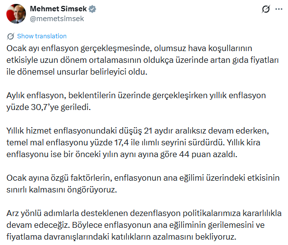 Bakan Şimşek, yaptığı açıklamada “olumsuz hava koşulları nedeniyle uzun dönem ortalamasının oldukça üzerinde artan gıda fiyatları”na işaret etti. Aylık enflasyonun beklentilerin üzerinde geldiğini kabul eden Şimşek, buna karşın yıllık enflasyonun yüzde 30,7’ye gerilediğini vurguladı. Hizmet enflasyonundaki düşüşün 21 aydır sürdüğünü, temel mal enflasyonunun ise ılımlı seyrini koruduğunu söyledi.