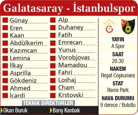 Ziraat Türkiye Kupası’na 2’de 2 ile başlayan Galatasaray, üçüncü sınavını 1. Lig ekibi İstanbulspor’a karşı verecek. Teknik direktör Okan Buruk, RAMS Park’ta oynanacak bu maçta yedeklere şans vermeyi planlıyor. Kaleyi Günay devralacak. Kazımcan ve Ahmed Kutucu gibi isimler ilk 11’de sahaya çıkacak. A Spor’dan ekranlara gelecek maçın öncesinde canlı bağlantılarla son dakika haberleri de yine A Spor ekranlarında olacak.