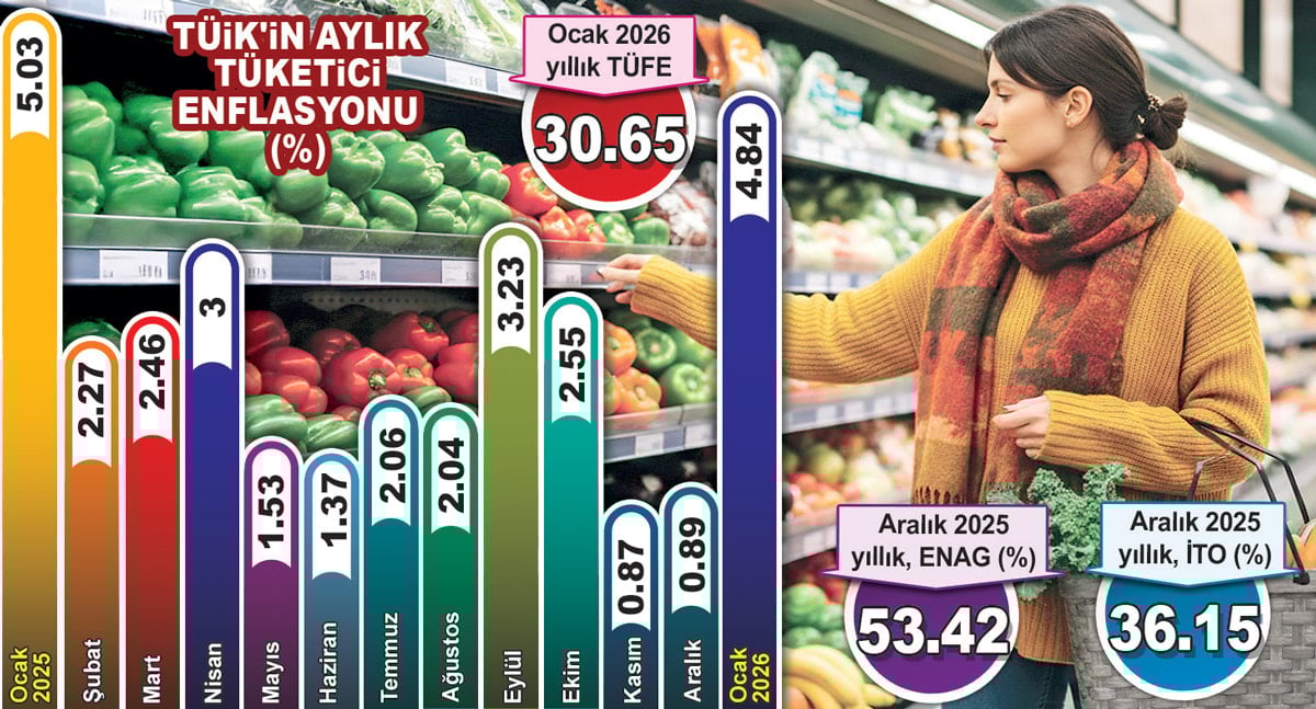 Ocak ayında enflasyon şaha kalktı, bu kışın sert geçeceği hızla yükselen fiyatlardan belli oldu. Türkiye İstatistik Kurumu’nun (TÜİK), tüketici fiyat endeksi (TÜFE) ocakta aylık yüzde 4.84 artış gösterirken, yıllık enflasyon yüzde 30.65 oldu. Yurt içi üretici fiyat endeksi (Yİ-ÜFE) yıllık yüzde 27.17, aylık yüzde 2.67 arttı. Yıllık enflasyonda zam şampiyonu yüzde 64.70 ile yine eğitim olurken, aylık enflasyonda 14.85 ile sağlık zirvede yer aldı.