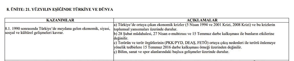 İnkılap Tarihi ve Atatürkçülük dersi kazanımları ile sınavda sorulacak olası sorulara, “Terörün ve terör örgütlerinin (PKK/PYD, DEAŞ, FETÖ) ortaya çıkış nedenleriyle terörü önlemeye yönelik tedbirlere, 15 Temmuz 2016 darbe kalkışması örneği üzerinden değinilir” denildiği görüldü. Böylece yasa dışı terör örgütleri ilk kez, YKS 2026 sınavında çıkacak sorular kapsamına alındı.