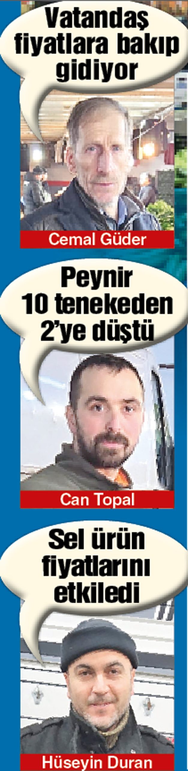 Patates ve soğan hariç sebze fiyatlarının yükselişe geçtiği pazarda özellikle biber ve domates el yakıyor. Pazarcılar, kuraklık ve dondan sonra Akdeniz’deki selin de ürünleri çok fazla etkilediğini vurguladı. Pazarcı Hüseyin Duran, “Bu mevsimde ürünlerin yüzde 90’ı Antalya ve Mersin’den geliyor. Oralarda çok ciddi sel oldu. Taze fasulye gibi bazı ürünler pazara çok az geldi” derken bir diğer pazarcı Can Topal ise “Eskiden 10 teneke satıyorsak şimdi iki teneke peynir satıyoruz. Yüzde 30 fiyat artışı var. Vatandaş akşam pazarına geliyor” diye konuştu.