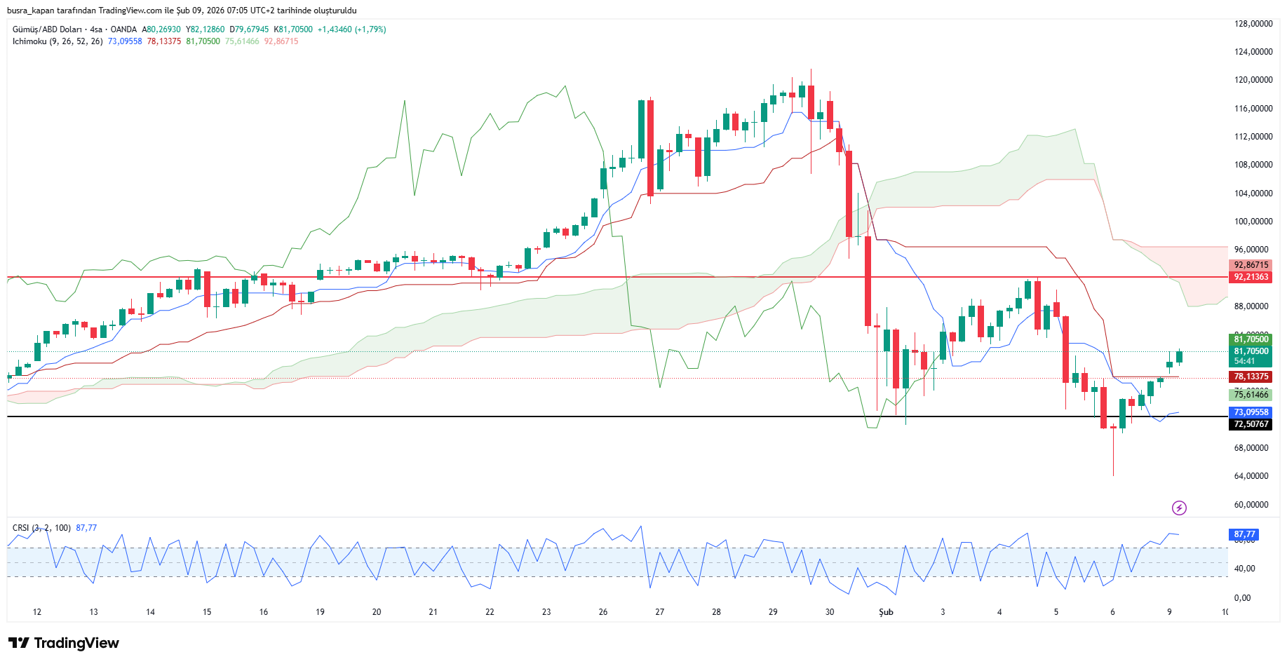 Ons gümüş güne 78,08 dolardan başladı. Gün içinde en düşük 78,01 dolar, en yüksek de 81,67 dolar seviyesi görüldü. Ons gümüş 08.02’de 81,72 dolardan işlem geçiyor.