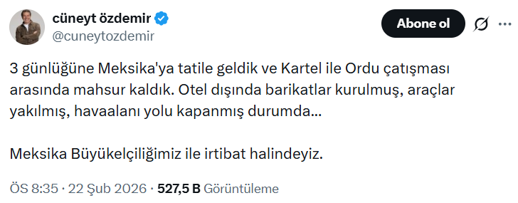 Bulunduğu otelden canlı yayın yapan Özdemir, Meksika’nın en büyük kartellerinden birinin liderinin öldürüldüğünü, Meksika’daki 6 ya da 8 eyalette misilleme eylemleri yapıldığını; otobüslerin, araçların yakıldığını, tüm uçuşların iptal olduğunu söyledi.