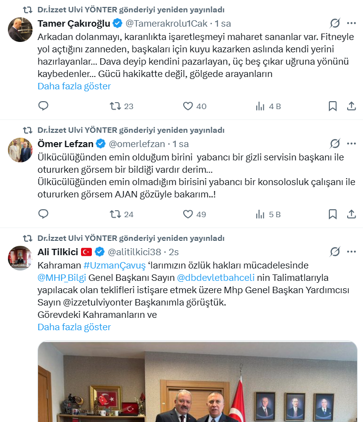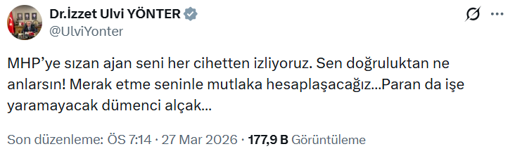 MHP Genel Başkan Yardımcısı İzzet Ulvi Yönter, sosyal medya hesabından yaptığı paylaşımda, “MHP’ye sızan ajan seni her cihetten izliyoruz. Sen doğruluktan ne anlarsın! Merak etme seninle mutlaka hesaplaşacağız… Paran da işe yaramayacak dümenci alçak…” ifadelerini kullandı.