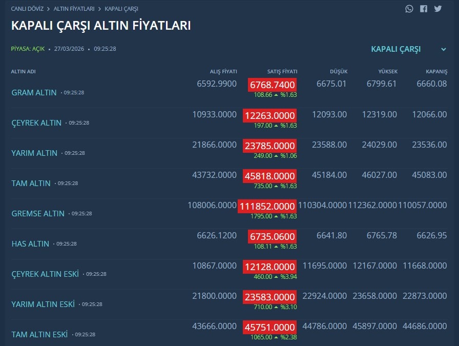 Kapalıçarşı altın fiyatları ile resmi altın fiyatları arasındaki fark devam ediyor. Kapalıçarşı’da gram altın 6 bin 768 liradan satılıyor. İşte Kapalıçarşı altın fiyatları…