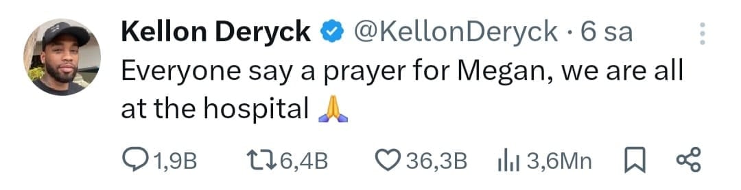 31 yaşındaki ünlü rapçiyle ilgili bir diğer açıklamada saç stilisti Kellon Deryck’tan geldi. Deryck sosyal medya hesabından yaptığı açıklamada, “Herkes Megan için dua etsin, hepimiz hastanedeyiz” ifadelerini kullandı.