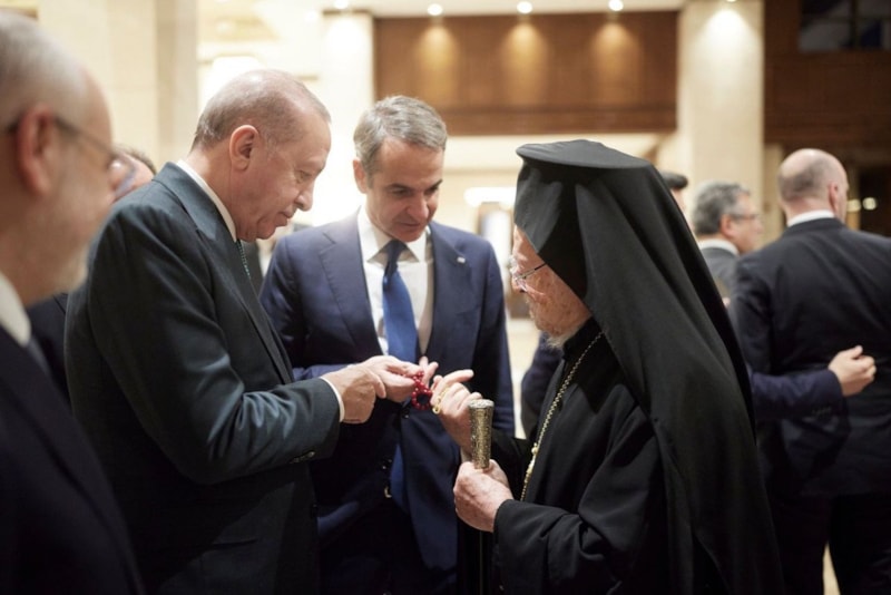 Patrik Bartholomeos’un da bulunduğu ortamda Erdoğan, Miçotakis ve Bartholomeos’un tespihler üzerine sohbet ettiği aktarıldı.