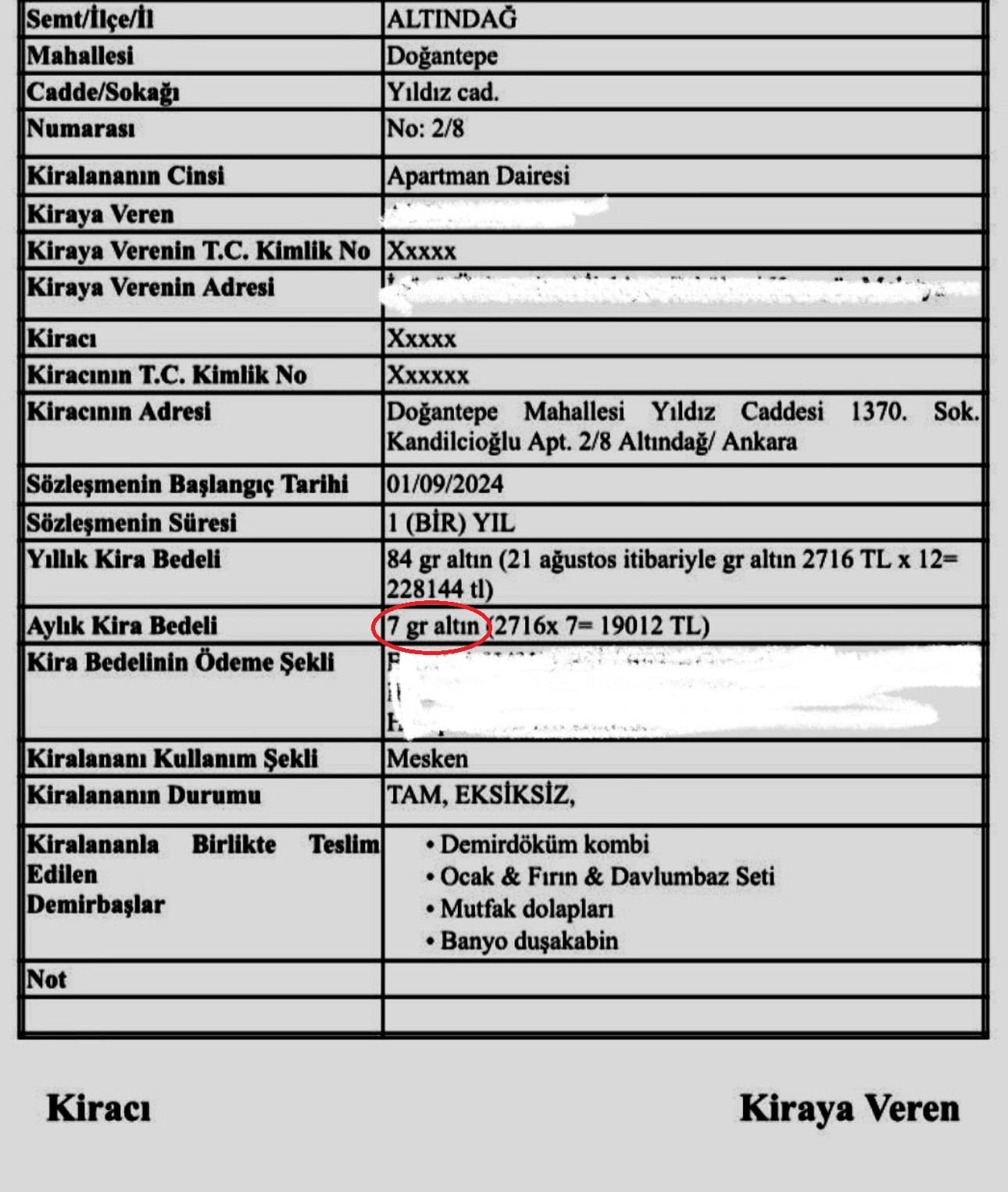 Duman, sözleşmede, aylık kira bedelini 7 gram altın, yıllık kira bedelini 84 gram altın ve depozito ücretini ise 500 dolar olarak belirledi.