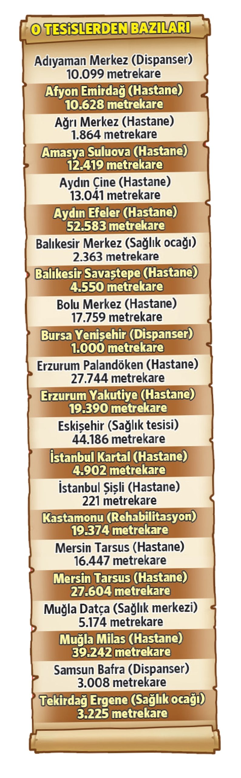 İktidarın satış listesine aldığı ancak sadece ada parsel verip detayını açıklamadığı gayrimenkuller arasında Türkiye’nin çeşitli il ve ilçelerindeki 32 hastane-sağlık ocağı-dispanser var. Satılık alanlar içinde en büyük tesis 52 bin metrekare büyüklükle Aydın’ın Efeler ilçesinde yer alıyor.