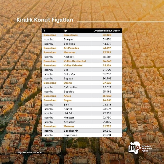 Gökçe, konut kiralarında da İstanbul’un birçok ilçesinin Barcelona’dan daha pahalı olduğuna dikkat çekerek “Örneğin Eyüpsultan’da ortalama konut kirası 25 bin 513 lira düzeyindeyken Barcelona’nın Anoia, Bages ve Moianes bölgelerinde bu fiyata ev kiralamak mümkün” dedi.