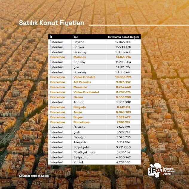 Örneğin Bakırköy’de ortalama satılık konut fiyatı 10 milyon 300 bin iken aynı fiyata Barcelona Valles Oriental bölgesinde ev almak mümkün. Beşiktaş’ta ortalama konut fiyatı 15 milyon TL iken Barcelona’nın Moianes bölgesinde ev fiyatı 13 milyon TL civarında.