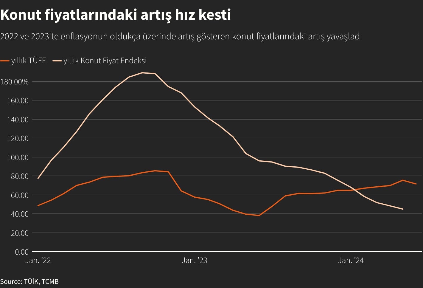 TCMB verilerine göre, Türkiye genelinde konut fiyat artışı yüzde 189 ile Eylül 2022’de tepe yapmıştı. Sonrasında fiyat artış hızı yavaşlasa da, 2023’te de enflasyonun üzerinde kalmaya devam etmişti. Konut fiyatlarındaki artış açıklanan son veriye göre, bu yıl mayıs ayında yüzde 45 seviyesinde bulunuyor.