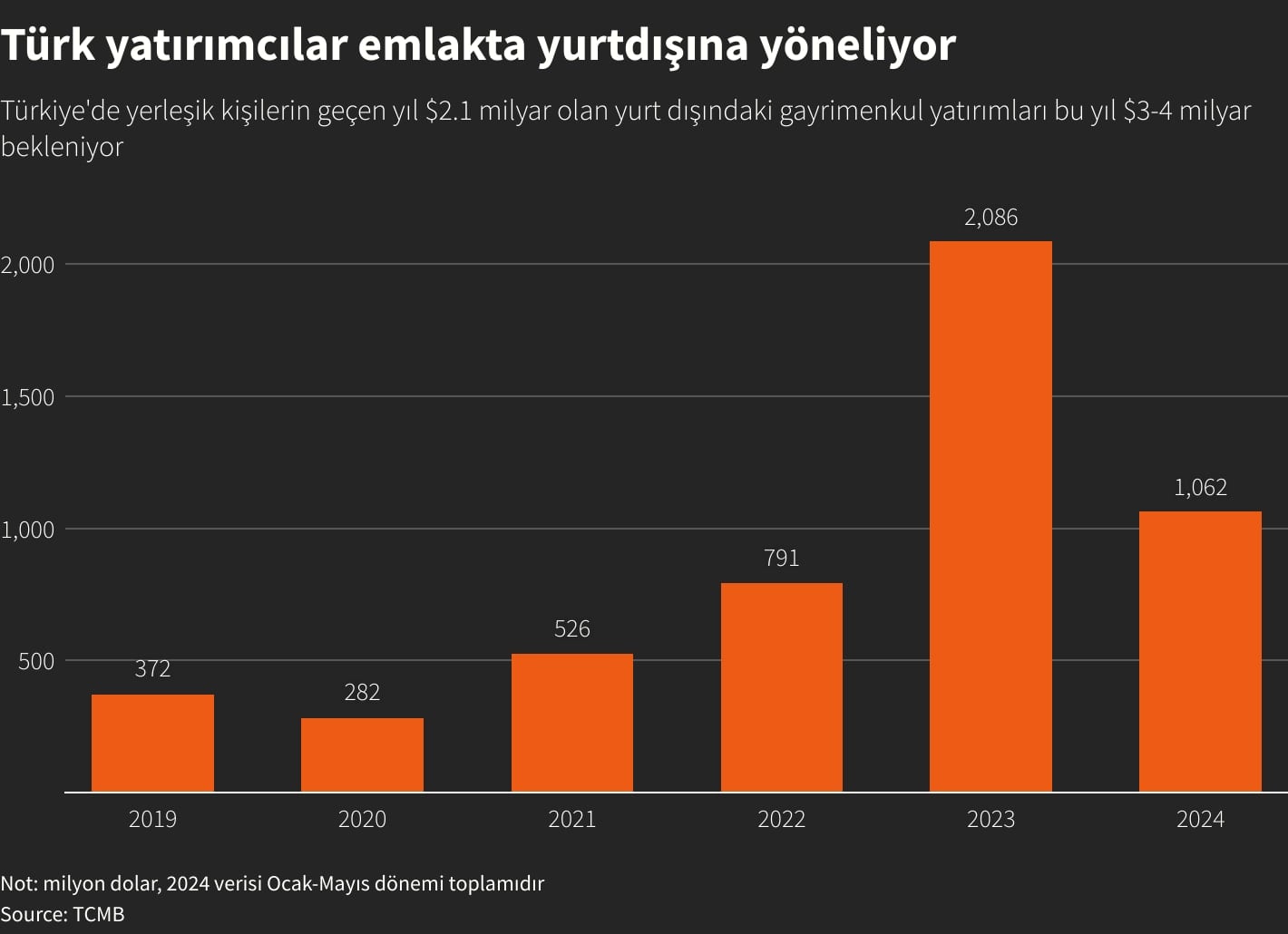 TCMB verilerine göre, yurt içinde yerleşik kişilerin yurt dışındaki gayrimenkul yatırımları 2023’te yüzde 164 artışla 2,09 milyar dolara yükseldi. Açıklanan son verilere göre bu yıl ilk 5 ayda ise aynı kalem geçen yılın aynı dönemine göre yüzde 51 artışla 1 milyar 62 milyon dolara ulaştı. Son bir yıllık rakam 2 milyar 444 milyon dolar oldu.