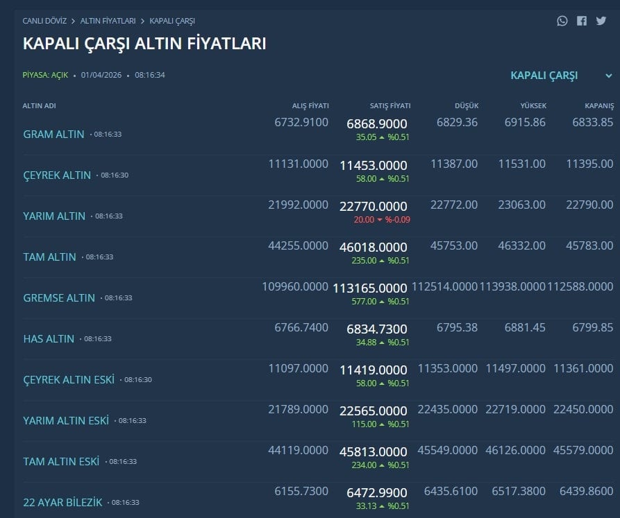Kapalıçarşı altın fiyatları ile resmi altın fiyatları arasındaki fark devam ediyor. Kapalıçarşı’da gram altın 6 bin 868 liraya yükseldi. İşte Kapalıçarşı altın fiyatları…