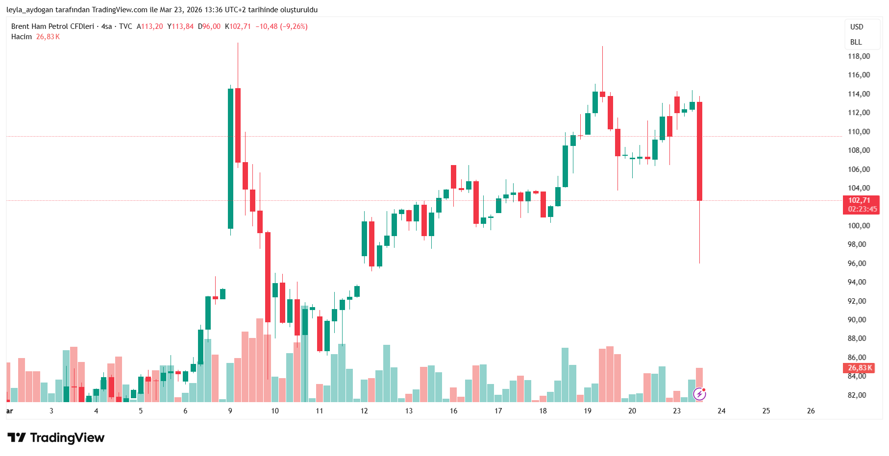 Trump’ın geri adım atmasının ardından Brent petrolün varili 113 dolardan 96,96 dolara kadar geriledikten sonra 101 dolarda hareketleniyor. Brent petrol Trump’tan gelen açıklamalar sonrasında yüzde 15 geriledi.
