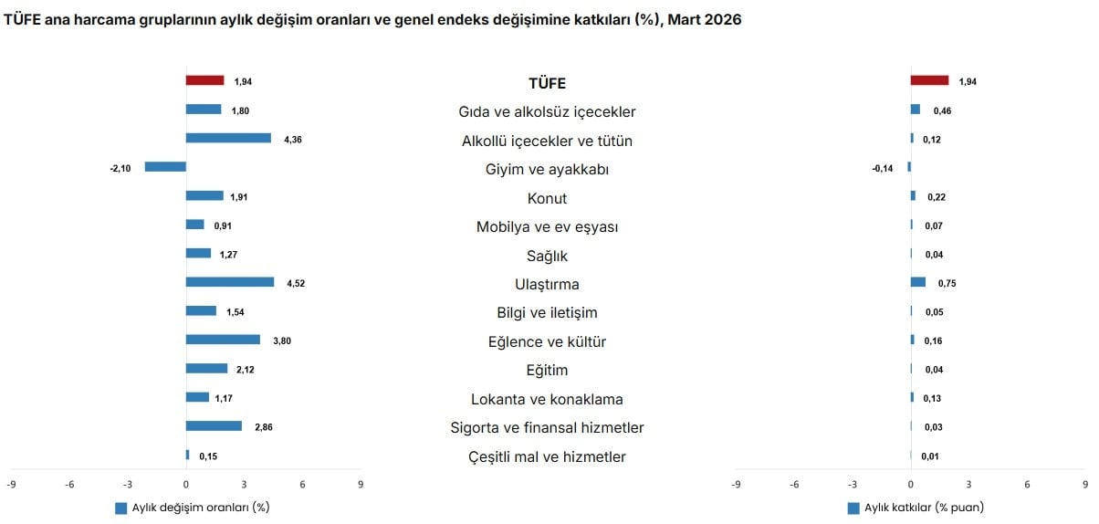 En yüksek ağırlığa sahip üç ana harcama grubunun aylık değişimleri; gıda ve alkolsüz içeceklerde yüzde 1,80 artış, ulaştırmada yüzde 4,52 artış ve konut, su, elektrik, gaz ve diğer yakıtlarda yüzde 1,91 artış olarak gerçekleşti. İlgili ana grupların aylık değişime olan katkıları ise gıda ve alkolsüz içeceklerde 0,46, ulaştırmada 0,75 ve konutta 0,22 yüzde puan oldu.