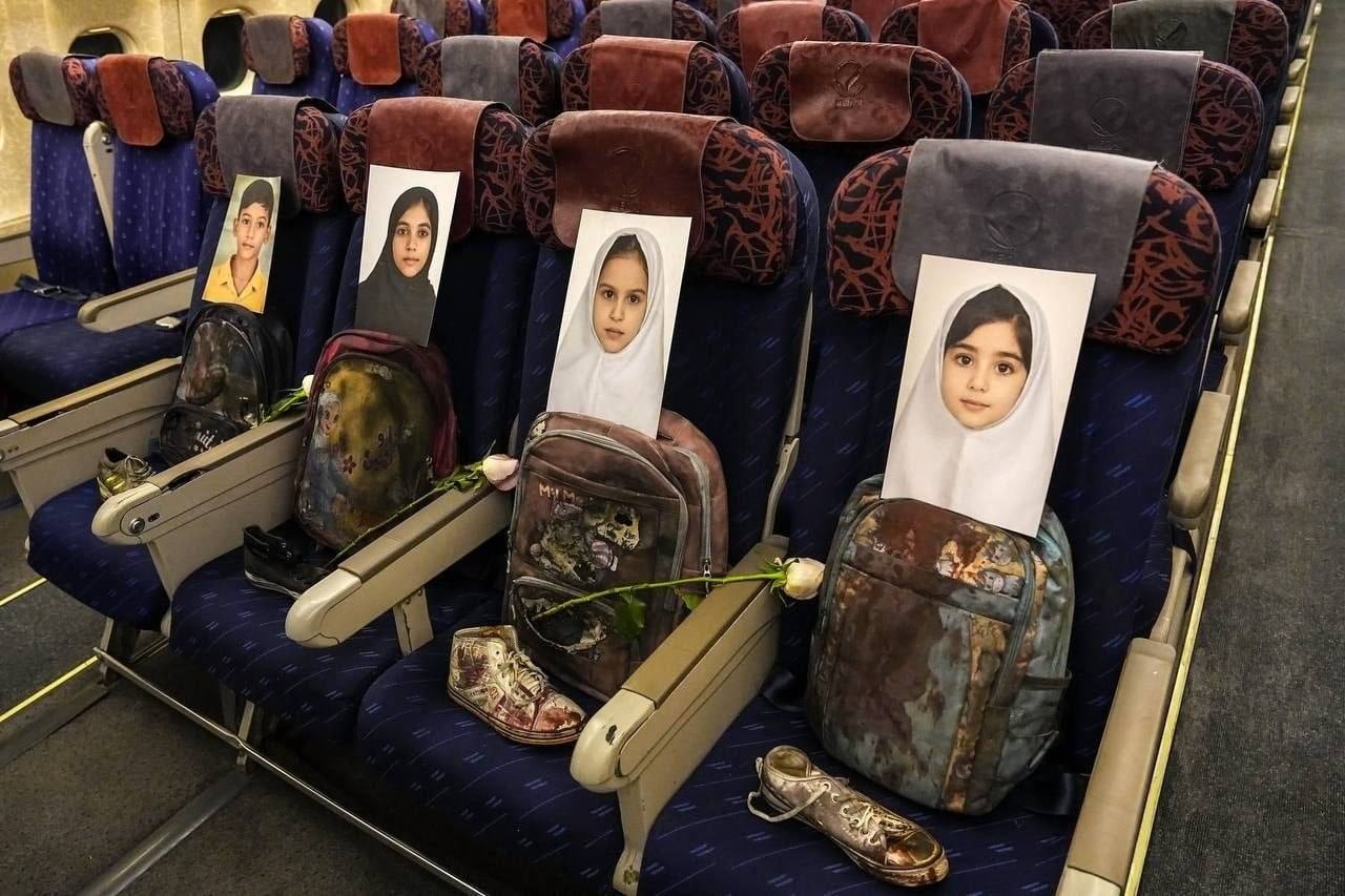 Görüntüde ise, ölen 168 çocuktan 4’ünün çantası ve fotoğraflar, beyaz bir gül ile birlikte İran heyetini taşıyan koltuklara oturtuldu. Galibaf, paylaşımında “Bu uçuşta birlikte Minab’da ölen 168 çocuğu taşıyoruz” dedi.